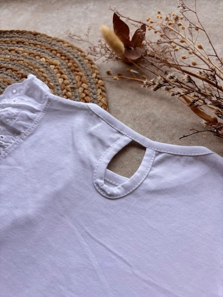 ¡Dulzura y frescura para las más pequeñas! Nuestra musculosa Milena es ideal para los días cálidos. Confeccionada en algodón suave, cuenta con delicados vuelos de broderie en los hombros que le dan un toque romántico y especial. Disponible en color blanco y natural, combina fácilmente con cualquier outfit.